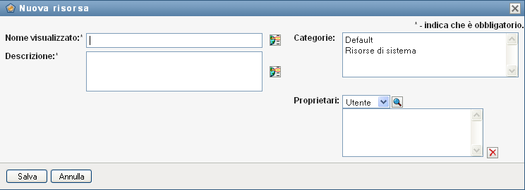 Nell'applicazione utente viene visualizzata la finestra di dialogo Nuova risorsa: