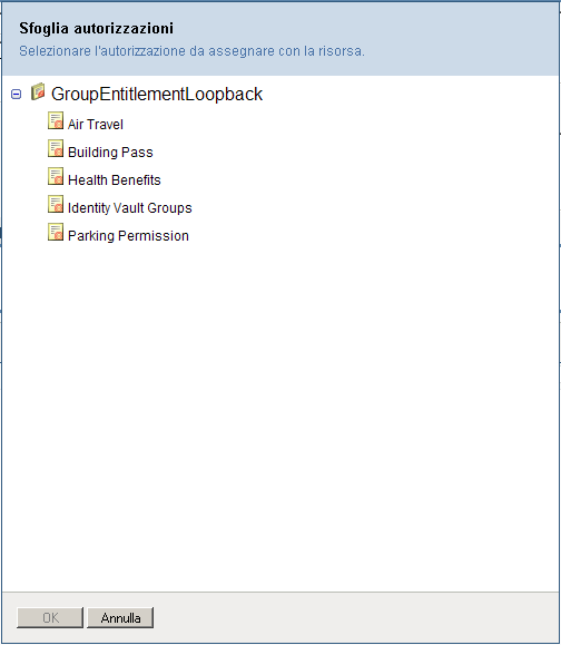 NOTA:se la risorsa DirXML non è stata configurata correttamente, quando si accede alla pagina per selezionare l'autorizzazione, verrà visualizzato un messaggio per indicare che le autorizzazioni non sono state configurate per la mappatura delle risorse.