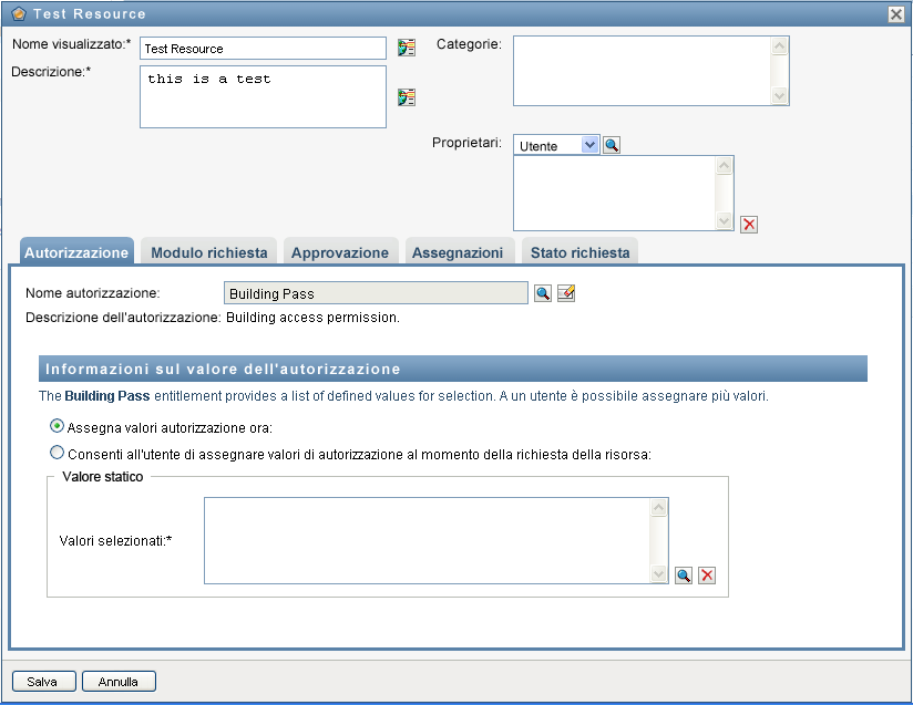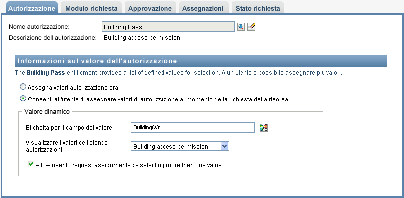 Autorizzazione che accetta uno o più valori di parametro. Ad esempio, una risorsa può essere associata a un'autorizzazione denominata Building Pass (Pass edifici) che consente al richiedente di selezionare uno o più edifici. I valori consentiti sono forniti da un elenco di autorizzazioni che può includere un elenco statico di valori definiti da un amministratore o un elenco dinamico di valori generati da una query LDAP. È possibile assegnare un valore al momento della progettazione quando si definisce la risorsa o consentire all'utente di assegnare un valore al momento della richiesta. Per ulteriori informazioni, vedere Associazione a un'autorizzazione con più valori. |