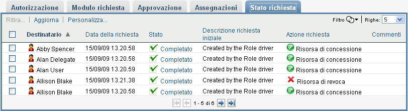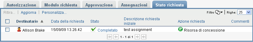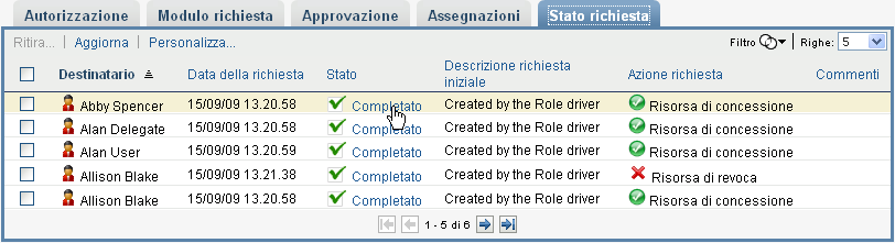 L'azione consente di visualizzare lo stato delle richieste di assegnazione di risorse, incluse quelle effettuate direttamente e le risorse assegnate attraverso i ruoli. Consente di controllare lo stato attuale di ogni richiesta. È inoltre possibile ritirare una richiesta non completata o non terminata qualora non sia più necessario eseguirla.
