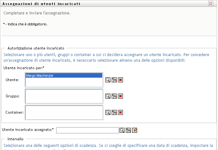 3. Se si è un amministratore di provisioning, selezionare uno o più utenti, gruppi e container per i quali si desidera definire un utente incaricato.