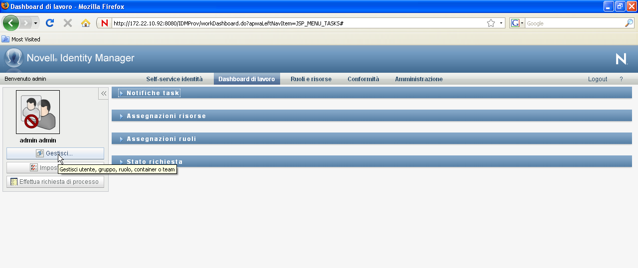 Nel dashboard di lavoro viene visualizzata la finestra popup Gestisci: