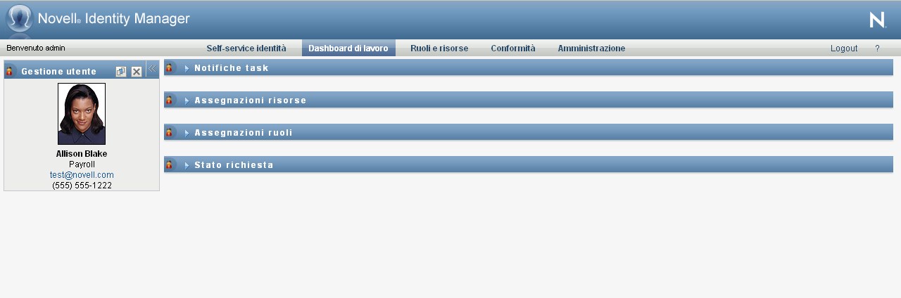 Quando si seleziona un utente, un gruppo, un container, un ruolo o un team, il dashboard di lavoro attiva immediatamente la modalità di gestione e aggiorna la sezione Profilo utente sul lato sinistro della schermata. La visualizzazione del profilo utente viene aggiornata nel modo seguente: