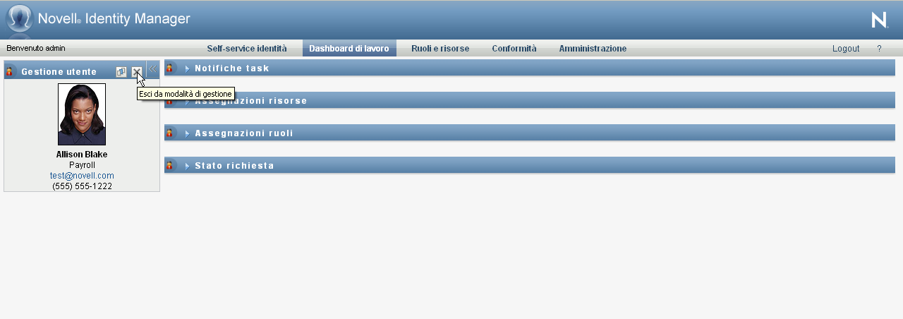 Per uscire dalla modalità di gestione e reimpostare il dashboard di lavoro in modo che visualizzi le autorizzazioni sui dati e sull'accesso per l'utente attualmente collegato: