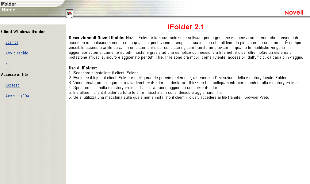 Inoltre, da questo sito gli utenti possono scaricare il client iFolder e accedere ai propri file iFolder tramite un browser, utilizzando l'applet Java o l'accesso HTML per Pocket PC come iPAQ*.