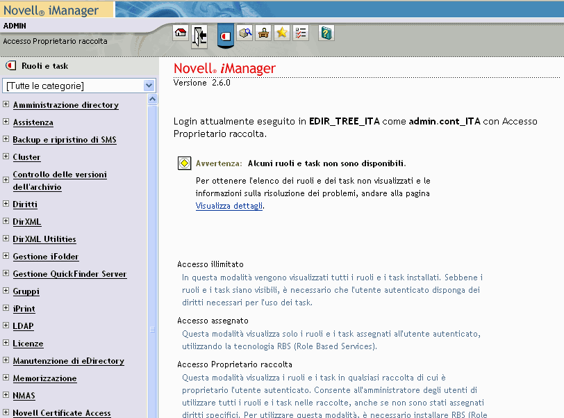 Guida: consente di visualizzare le informazioni pertinenti correlate alla pagina visualizzata.Per informazioni sulla modifica della vista Ruoli e task di default, vedere Configurazione e personalizzazione di iManager.