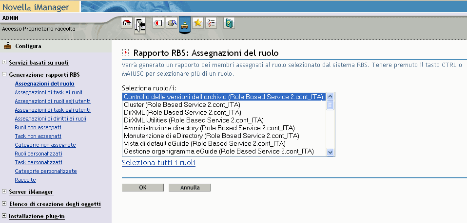 Ogni rapporto richiede l'immissione di alcune informazioni iniziali, ad esempio i ruoli per cui si desidera generare un elenco di membri assegnati. Dopo avere fornito le informazioni e avere fatto clic su OK, in iManager viene generato un rapporto.