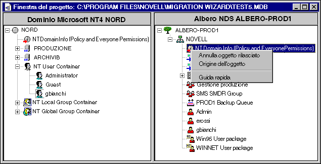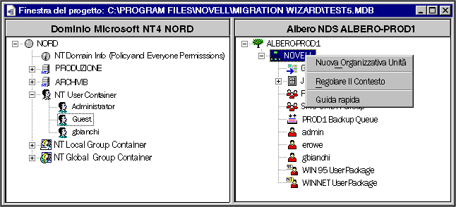 Nella finestra del progetto è possibile creare scenari di migrazione differenti prima di eseguire realmente la migrazione, senza apportare alcuna modifica al dominio NT o all'albero NDS di destinazione. Poiché tutte le operazioni di pianificazione nella finestra del progetto vengono eseguite off-line, gli oggetti spostati e creati nella finestra del progetto vengono effettivamente spostati o creati solo dopo l'avvio della migrazione.