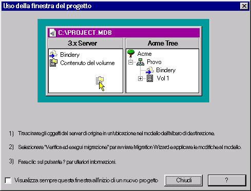 La maggior parte del lavoro viene eseguita nella finestra del progetto, che consente di trascinare e rilasciare dati dei volumi e oggetti del bindery di NetWare 3 in container dell'albero NDS di destinazione.