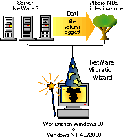 Nella seguente figura č illustrato il processo di migrazione dei dati da pių server NetWare 3 in un albero NDS di destinazione tramite Migration Wizard.