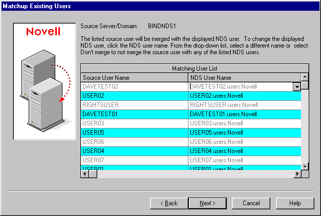 Se si è certi che nessuno degli utenti NDS nell'elenco rappresenta la stessa persona dell'utente NetWare 3 adiacente, fare clic sulla freccia accanto al nome utente NDS, quindi scegliere Non eseguire fusione.