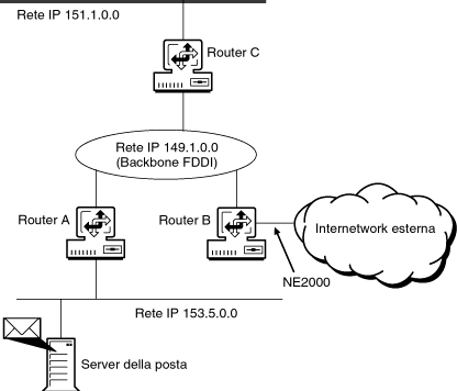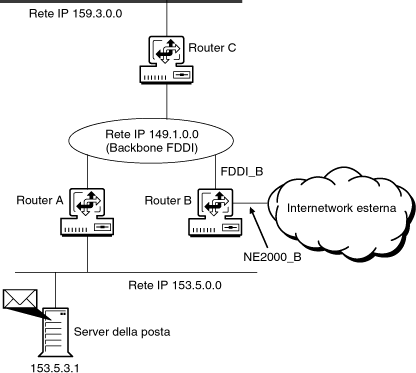 The source of the second filter is all packets originating from external networks. Because the interface NE2000_B is the only connection that Router B has to the external networks, this can be used to specify the source field for this filter. SMTP (Simple Mail Transfer Protocol) is selected from the predefined services list. The allowable destinations are limited to the corporate mail servers. Host 153.5.3.1 is the only mail server defined.