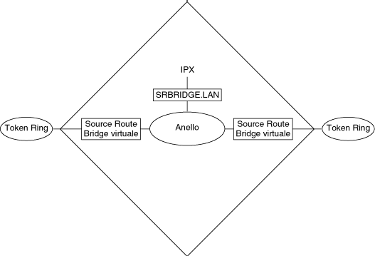 The virtual internal ring is attached to each bridged interface through a separate virtual internal bridge (as described in "Configuring Multiport Bridging”). In this case, the required protocol must be attached to the virtual internal ring through a virtual token ring board that uses the SRBRIDGE.LAN driver. The virtual board is then attached to the virtual internal ring automatically. Figure 14-4 shows an example of this configuration using IPX. Note that the two token rings might be part of a larger looped topology.