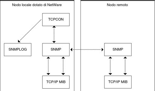 SNMP.NLM acts as an SNMP Agent for clients. It presents the standard TCP/IP portion of the MIB and generates trap messages required by the TCP/IP protocol stack. TCPCON is a client of the SNMP Agent NLM. It uses SNMP to communicate with the TCP/IP protocol stack.