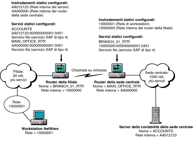 When used with on-demand calls, static routes and services are useful for connections that use expensive telecommunications carriers and for slow links over which it is undesirable to exchange routing and service information. Consider an internetwork that connects tens to hundreds of branch offices to a single main office. Typically, each branch office requires periodic access to information at the main office. However, it is most likely that the main office periodically polls the branch offices to get up-to-date information, such as the day's sales figures. Because a permanent call to each branch office is not necessary, connections to the main office need only be low-speed, dial-up lines. For this reason, the first several minutes of the call should not be taken up by a flood of routing and service information into a branch office. Nor should there be a relatively smaller flood of (mostly irrelevant) routing and service information from a branch office into the main office.