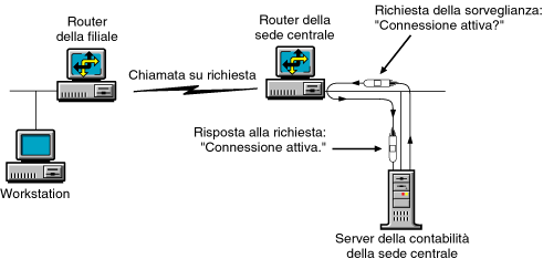 Routed on-demand calls are well-suited for large corporate networks that have many branch offices. In this type of internetwork, most of the traffic is unidirectional: from the branch office to the corporate network. Configuring each branch office with a single (default) route to the corporate network is sufficient. When a branch office router establishes a link to the router serving the corporate network, the routing protocol floods the branch office routes into the corporate network. This is necessary so that responses to branch office service requests know how to reach their destination in the branch office network. As long as the branch office forwards information to the corporate network, the link remains active. If the link is idle for some predetermined period of time, it goes down.