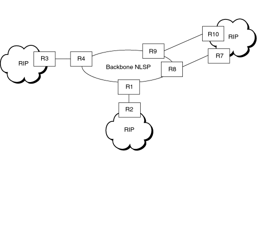 Figure 1-14 shows a typical topology for using route aggregation, a backbone network with several RIP areas attached. In Figure 1-14, the information within the backbone is minimized by having routers R1, R4, R8, and R9 report address summaries for the attached areas. In this scenario, the default route is the only information about reachable external addresses that must be transmitted within an attached area. Therefore, information within the attached areas is minimized.