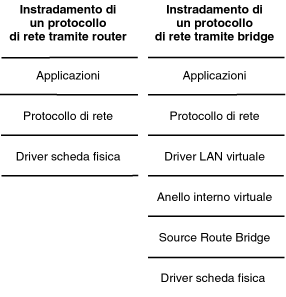 This indirect attachment allows access to the application above the Transport/Network layer, as shown in the bridging portion (right side) of Figure 4-10. Figure 4-10 also shows routing (left side) in comparison with bridging. Note that because a protocol can be attached only to Data-Link layer board drivers, access to applications can be achieved only by attaching the protocol directly to an interface (routing the protocol) or by attaching the protocol to the interface through the virtual board (SRBRIDGE.LAN), the virtual internal ring, and the bridge.