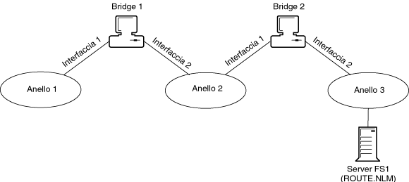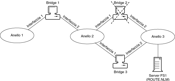 Figure 4-12 shows a network that does not contain any fault tolerance for bridge failure. The primary server, FS1, is located on Ring 3. If Bridge 2 fails, clients on Ring 1 and Ring 2 cannot communicate with the server.