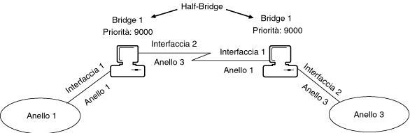 As shown in Figure 4-16, both half-bridges have the same bridge number. The bridges also maintain the same ring numbers assigned to the interfaces.