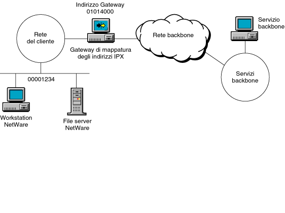 In Figure 1-15, any packets generated from the client on the customer network for the backbone have their source IPX network number converted to the 01014000 gateway address. In addition to mapping a client network address to an address compatible with the backbone, IAMG converts the IPX node address to a unique value based on characteristics of the original node number. Services on the customer network, such as file servers with Novell Directory Services (NDS) that advertise their network addresses through SAP and that must be visible in the backbone, are not translated. To be visible in the backbone network, the services must use a registered backbone address. All registered source addresses are left untranslated.