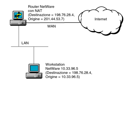 When the host with private address 10.33.96.5 wants to access a host on the Internet with the public address 198.76.28.4, it sends packets to its primary router. The router has a default route configured on the WAN interface, so packets are forwarded to the WAN interface. NAT then translates the source address 10.33.96.5 in the IP header with the globally unique address 201.44.53.7 and a new source port before packets are forwarded. Similarly, IP packets on the return path undergo the reverse address and port translation.