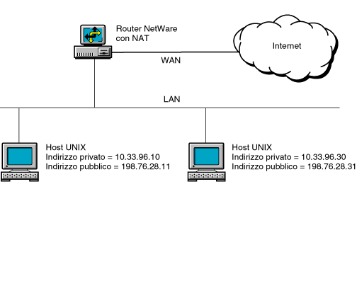 Figure 2-23 shows an application of NAT in static mode. In this case, NAT is configured to allow hosts on the public network to access two UNIX hosts on the private network. The private addresses of the hosts are 10.33.96.10 and 10.33.96.30. The network address translation table is configured to translate these private addresses to the public IP addresses 198.76.28.11 and 198.76.28.31, respectively. To configure more than one public address in the network address translation table, you must configure the NAT-enabled interface using multihoming as described in Novell Internet Access Server 4.1 Routing Configuration.