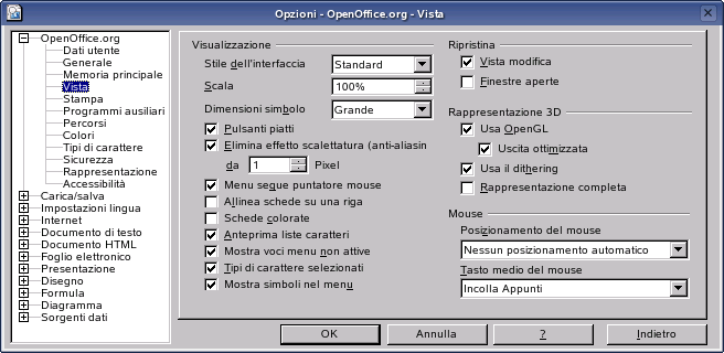 Le impostazioni globali possono essere modificate in qualsiasi applicazione OpenOffice.org facendo clic su Strumenti > Opzioni sulla barra dei menu. Verrà aperta la finestra illustrata nella Finestra di dialogo Opzioni. Per visualizzare le categorie delle impostazioni viene utilizzata una struttura ad albero.