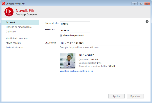 Durante la configurazione iniziale dell'applicazione desktop Filr si specificano le informazioni relative all'account e al server Filr. Dopo la configurazione iniziale, è possibile modificare le informazioni in qualsiasi momento: