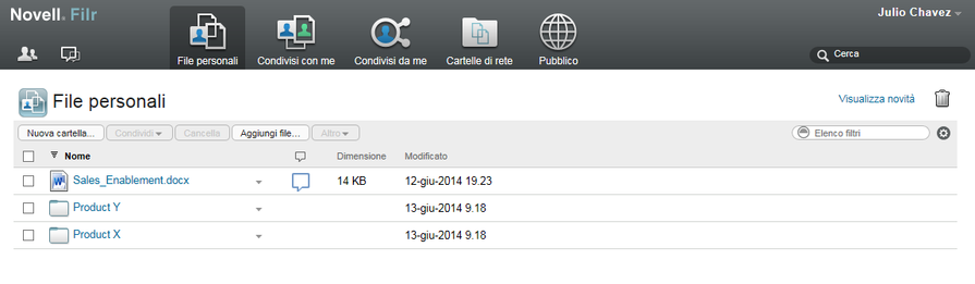 La prima volta che si avvia Novell Filr in un browser Web, viene visualizzata la pagina File personali, in cui è possibile gestire tutti i file creati dall'utente.