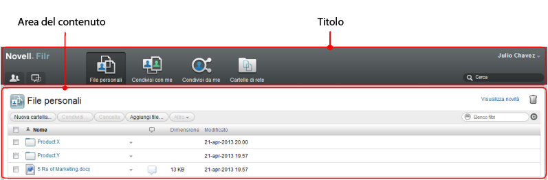 Nell'area del contenuto di Filr viene visualizzata la maggior parte delle informazioni.