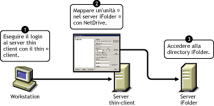 Una volta che NetDrive è installato sul server thin-client, un utente mobile può utilizzarlo per mappare un'unità al server iFolder, fornendo quindi l'accesso tramite Esplora risorse alla copia dei propri dati sul server iFolder (per una rappresentazione grafica, vedere Passo 9).