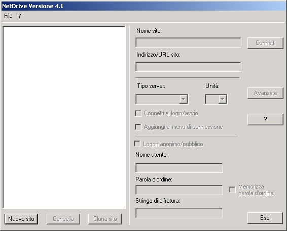 All'avvio di NetDrive viene visualizzata la finestra principale del programma, come illustrato nella seguente figura:
