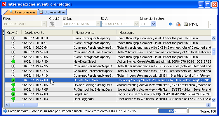 Fare clic su per visualizzare l'elenco di eventi e i dettagli associati nella finestra Browser attivo.