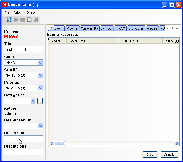 Assegnare il nome CasoTest1·e fare clic su . Quando viene visualizzata la notifica relativa alla riuscita dell'operazione, fare clic su .