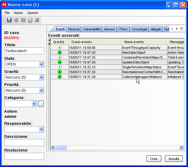 Fare doppio clic sul caso per visualizzare gli eventi.