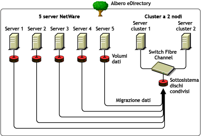 Nel primo scenario, si supponga di disporre di cinque server NetWare 5 a cui sono stati aggiunti di recente due server multiprocessore e l'hardware necessario per la creazione di un cluster a due nodi basato su rete SAN (Storage Area Network). È stato deciso di installare NetWare 6.5 sul cluster a due nodi poiché questo sistema operativo offre il supporto completo per i sistemi multiprocessore e comprende il software Novell Cluster ServicesTM e una licenza per cluster a due nodi. L'obiettivo consiste nella migrazione dei dati da ognuno dei cinque server alla rete SAN sul cluster a due nodi. Anziché spostare manualmente tutti i dati e gli agenti stampante oppure eseguire il backup dei dati e quindi ripristinarli sulla SAN, è possibile utilizzare NetWare Server Consolidation Utility per eseguire automaticamente il processo di migrazione dei dati.
