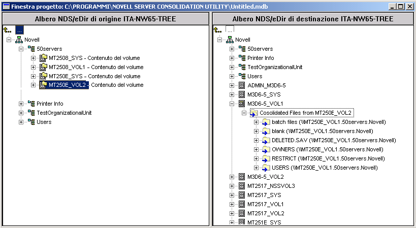 Nella finestra del progetto (vedere la Figura 3) è possibile scegliere i volumi e le directory da copiare e gli oggetti Stampante da spostare. Questa finestra è suddivisa in due riquadri, ognuno dei quali contiene gli alberi attualmente disponibili.