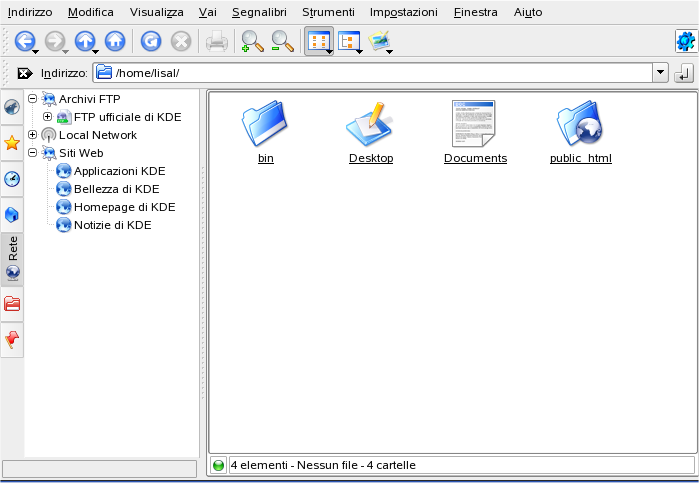 Per avviare Konqueror come file manager, fare clic sull'icona della casa nel pannello. Viene visualizzato il contenuto della home directory.