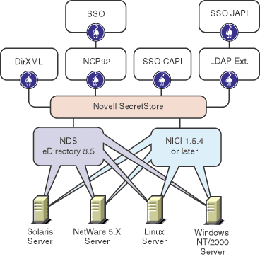 When you install NSSO 2.1 on these servers, the installation program installs the SecretStore service on top of NDS eDirectory and NICI. SecretStore plug-ins run on top of SecretStore.
