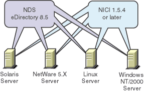 The Solaris and Linux servers require NDS eDirectory 8.5 or Corporate Edition 8.5. (NICI is automatically installed during server installation.)