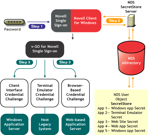 - In Step 3, the user accesses a Windows, Web-based, or host-based application. v-GO for Novell Single Sign-on recognizes the application and responds with the appropriate username and password.