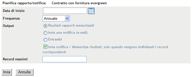 Output: scegliere se archiviare il rapporto, inviare una notifica via e-mail quando il rapporto è pronto o entrambi. È inoltre possibile scegliere di archiviare i risultati o inviare una notifica solo quando vengono trovati record corrispondenti. Per ulteriori informazioni sulla configurazione di indirizzi e-mail, vedere Sezione 6.2.5, Configurazione degli indirizzi e-mail per l'invio di notifiche.