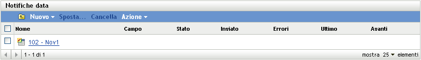 Nella pagina Notifica data vengono visualizzate le notifiche data configurate al momento della creazione del contratto. Fare clic su una notifica esistente per visualizzare o modificare le impostazioni e-mail.