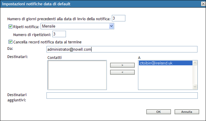 Compilare i campi nella finestra di dialogo Impostazioni di notifica data di default.
