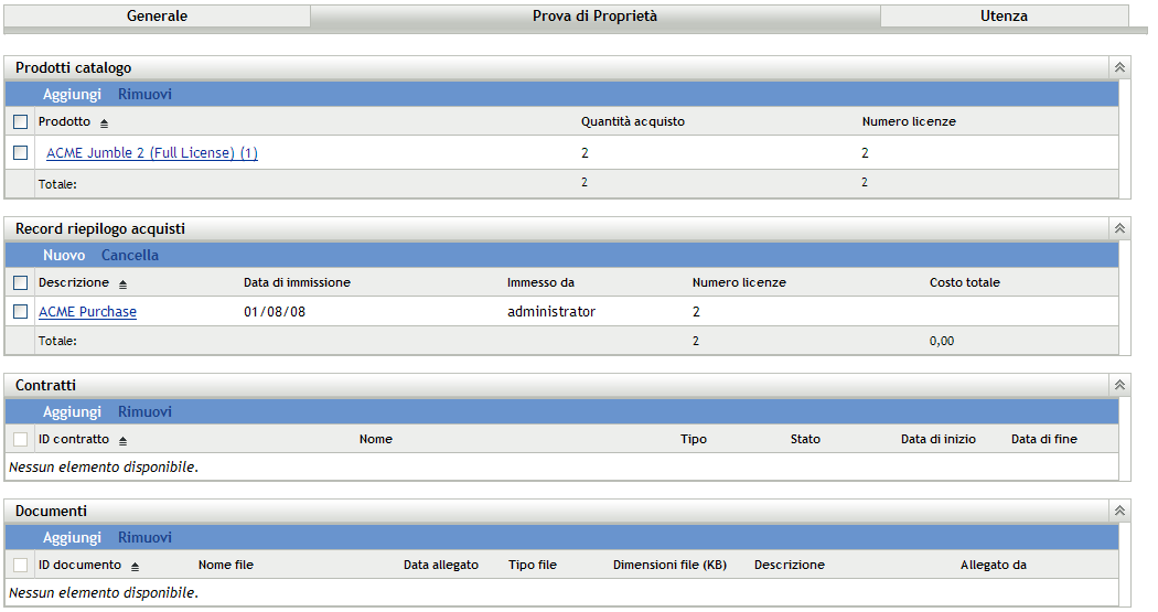 La pagina Prova di Proprietà include i seguenti riquadri: