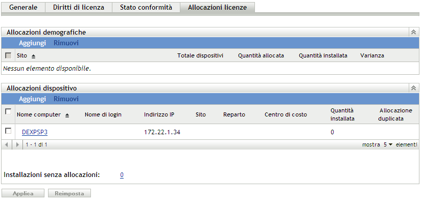Allocazioni demografiche: mostra il numero di licenze allocato per tipo demografico (sito, reparto o centro di costo) oltre al numero di dispositivi e alla quantità installata per valore demografico. Questo riquadro viene visualizzato solo se le allocazioni demografiche sono abilitate (scheda > riquadro Impostazioni allocazioni licenze).