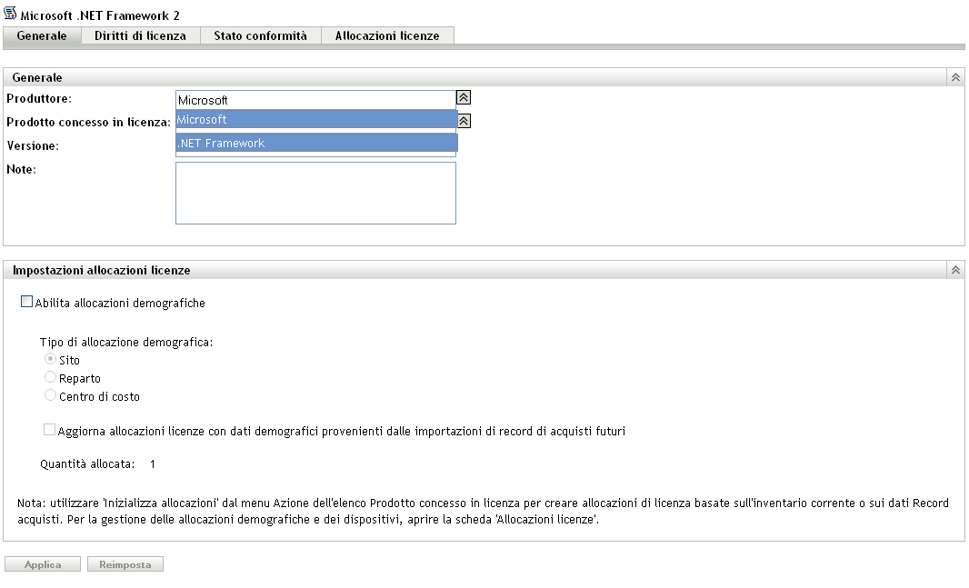 Nella pagina Generale è possibile visualizzare informazioni generali sul prodotto concesso in licenza e indicare se la licenza supporta o meno allocazioni demografiche.