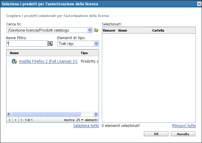 Nella finestra di dialogo Seleziona i prodotti per l'autorizzazione della licenza, selezionare un prodotto catalogo.