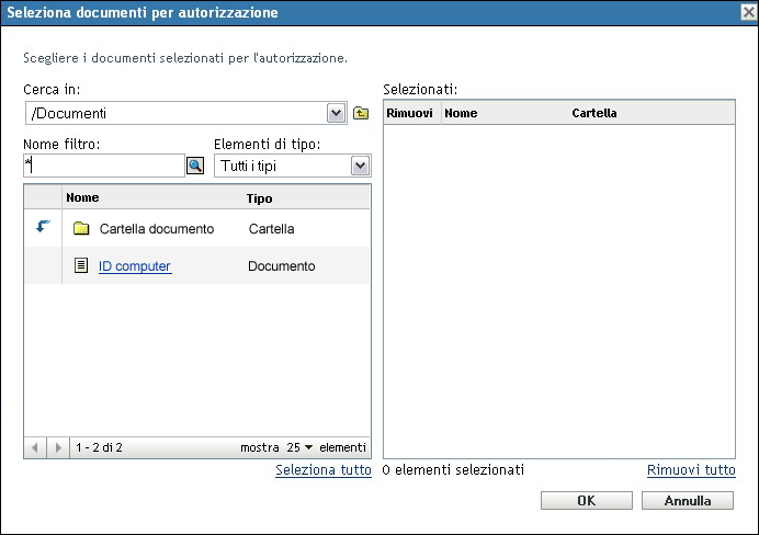 Nella finestra di dialogo Seleziona documenti per autorizzazione, specificare un documento, quindi fare clic su .